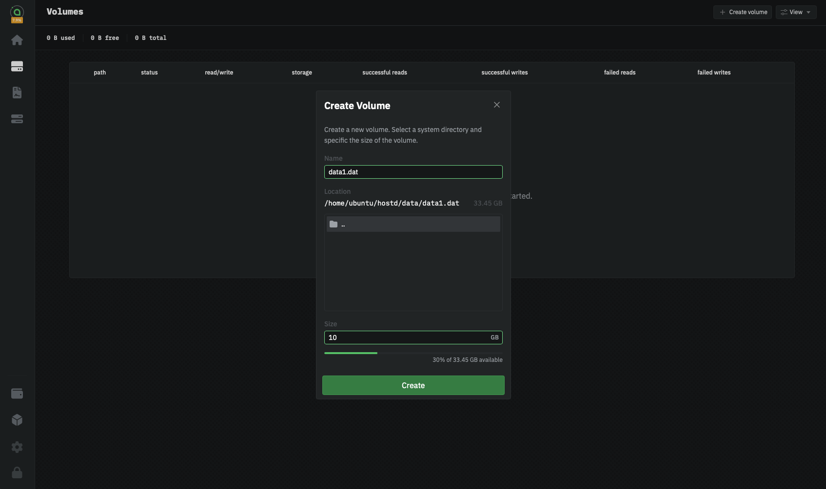 A "volume" is a location on disk where hostd will store uploaded data. A volume can be anywhere, including network drives and external drives. You can create multiple volumes to combine storage from multiple drives. To add a volume:
