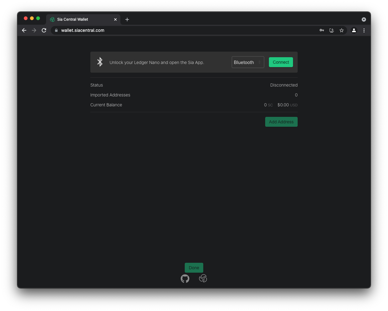 You will now need to connect your device and import an address to send Siacoins to. When connecting you can choose either USB or Bluetooth depending on your browser's support.