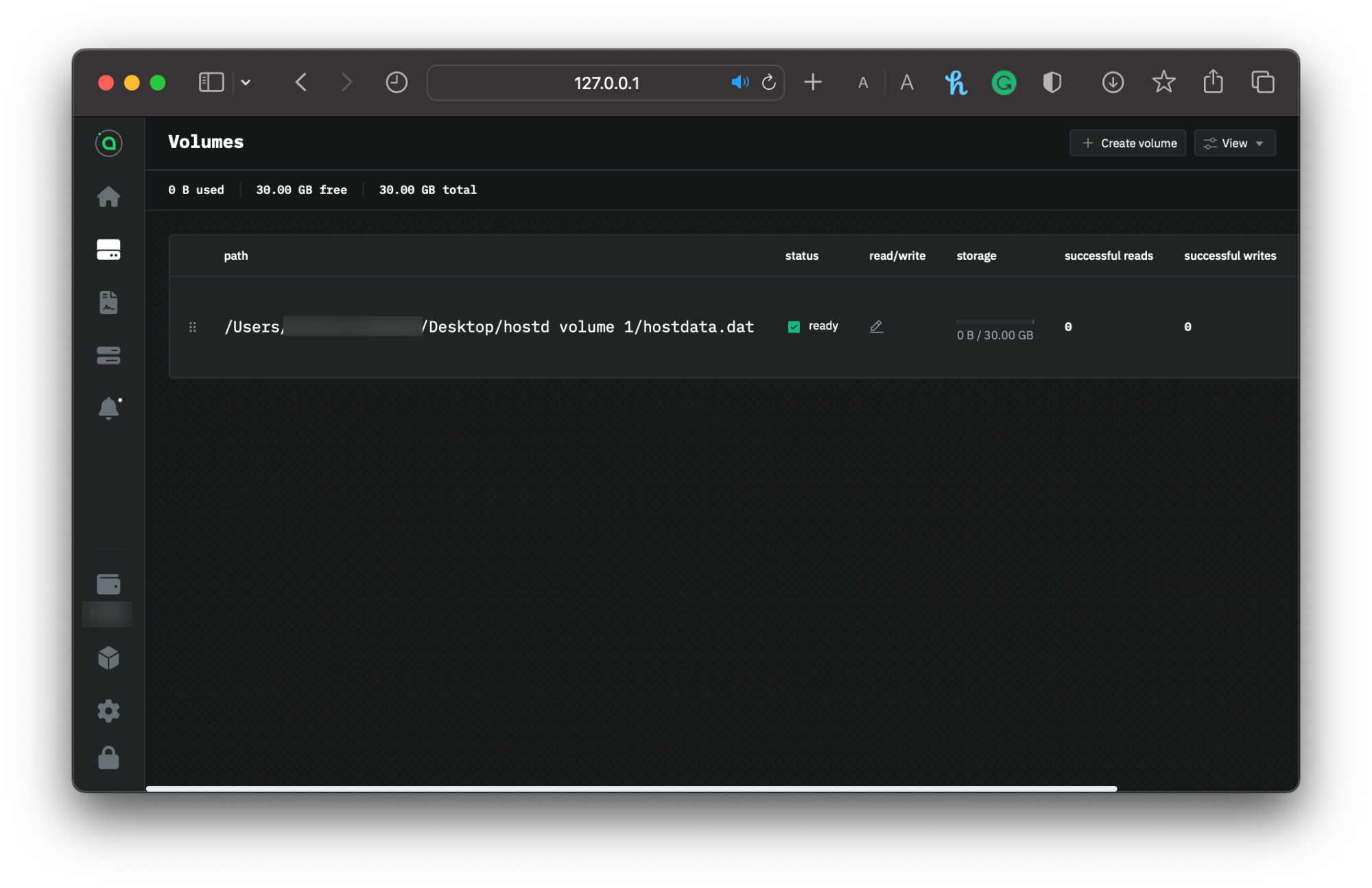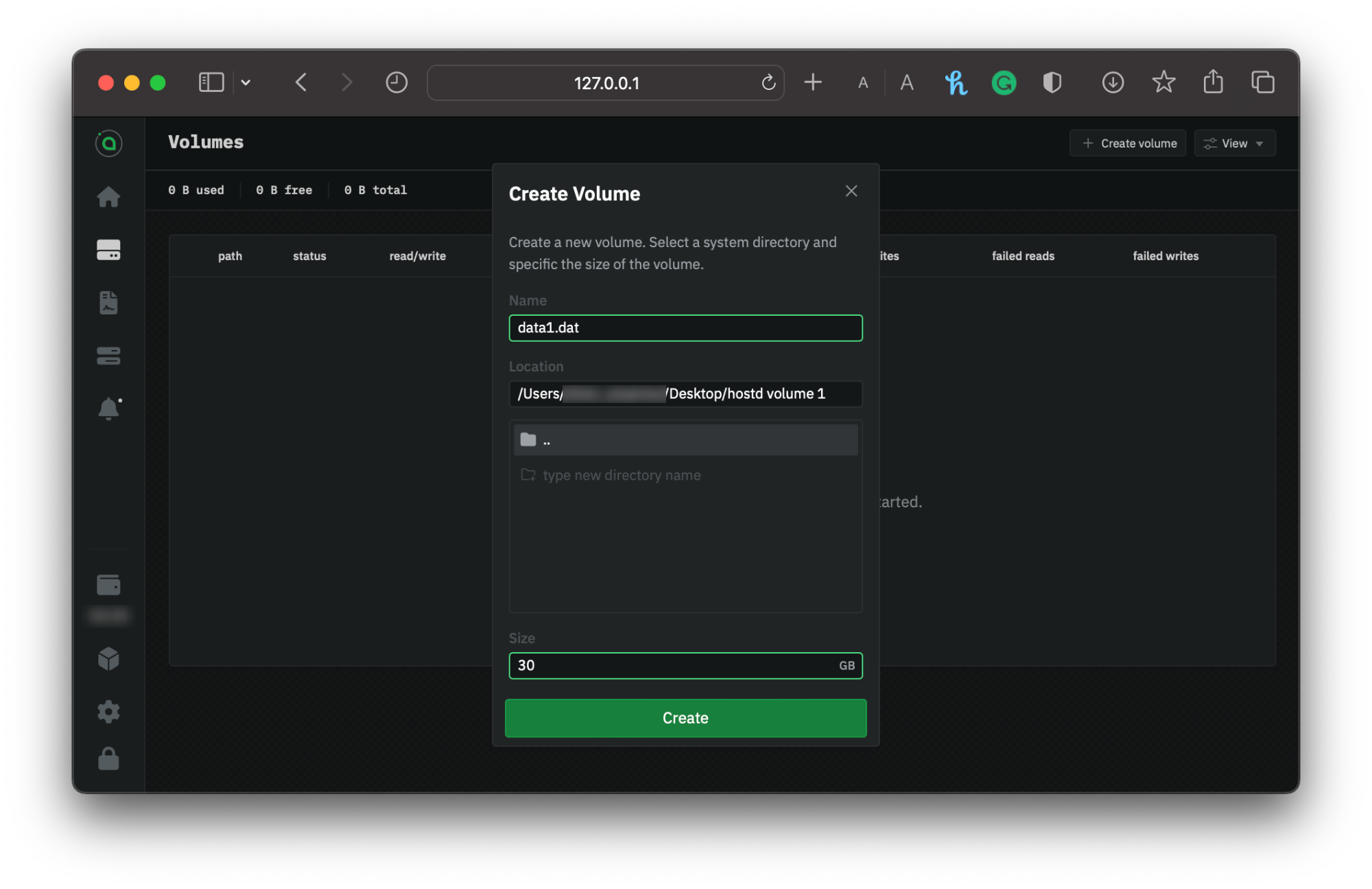 4. Click **Create** to add the volume to `hostd`.