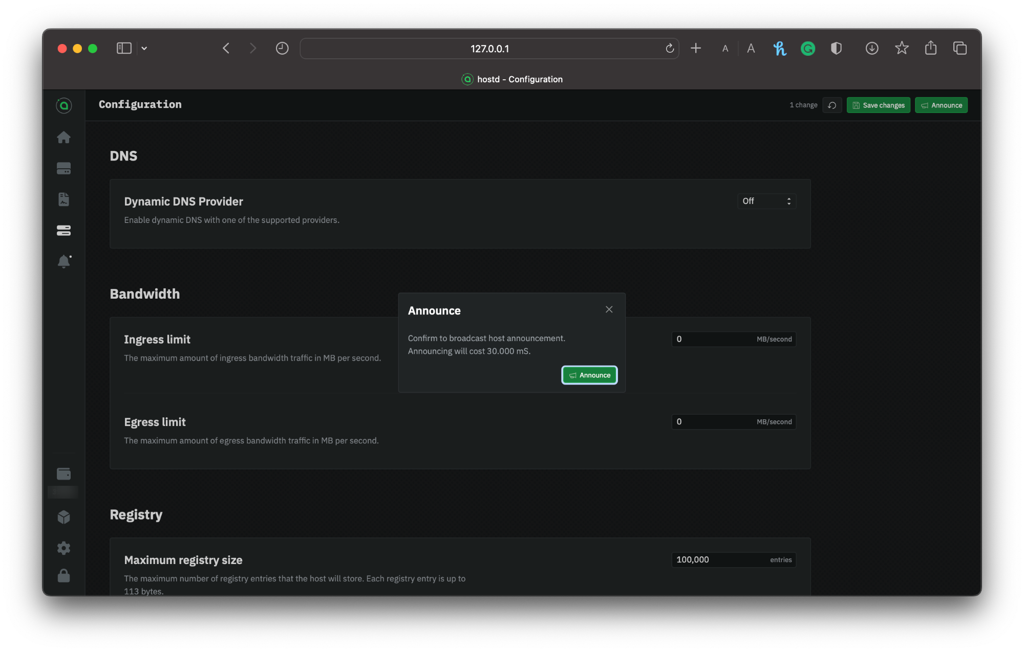 Go to hostd. If you're asked to unlock the UI, use your custom password if you've set one. If you haven't got a wallet set up in hostd, visit our Setting up hostd guide; otherwise, choose from the sidebar Configuration.