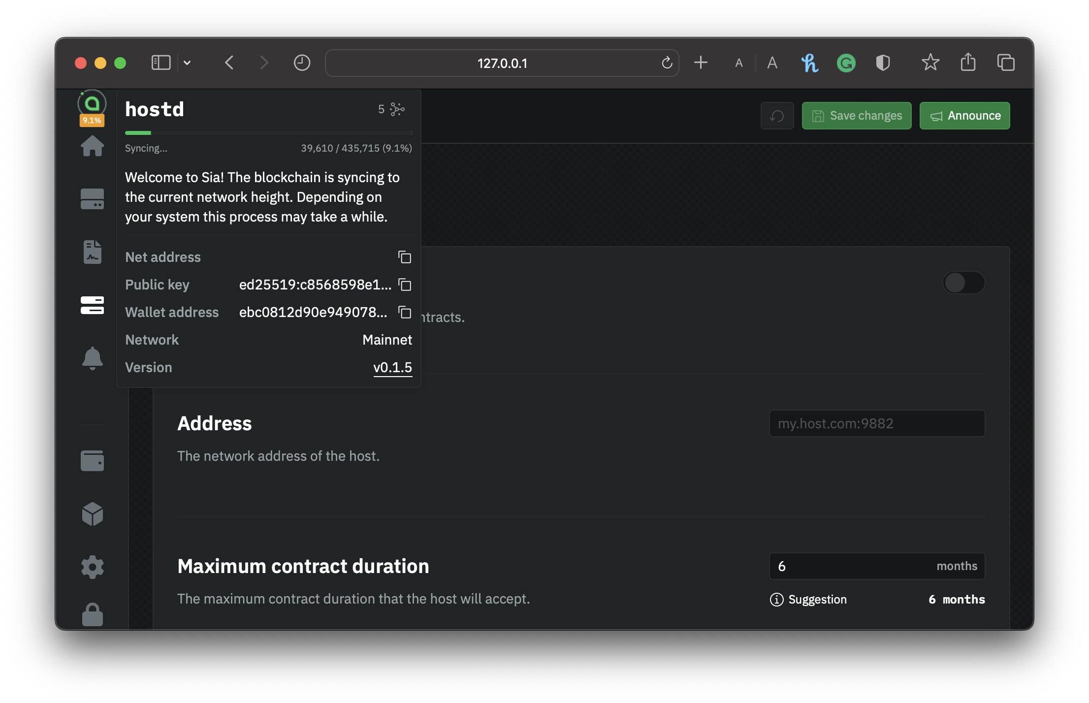 Setting your storage node's network **Address** is essential because it's published to the blockchain and used by renters to connect to your node. Some users use their public IP address, but we recommend setting up a domain.