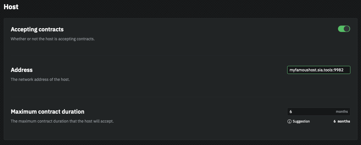 3. Change the "Address" field to the domain name you set up. (e.g. `myfamoushost.sia.tools:9982`)