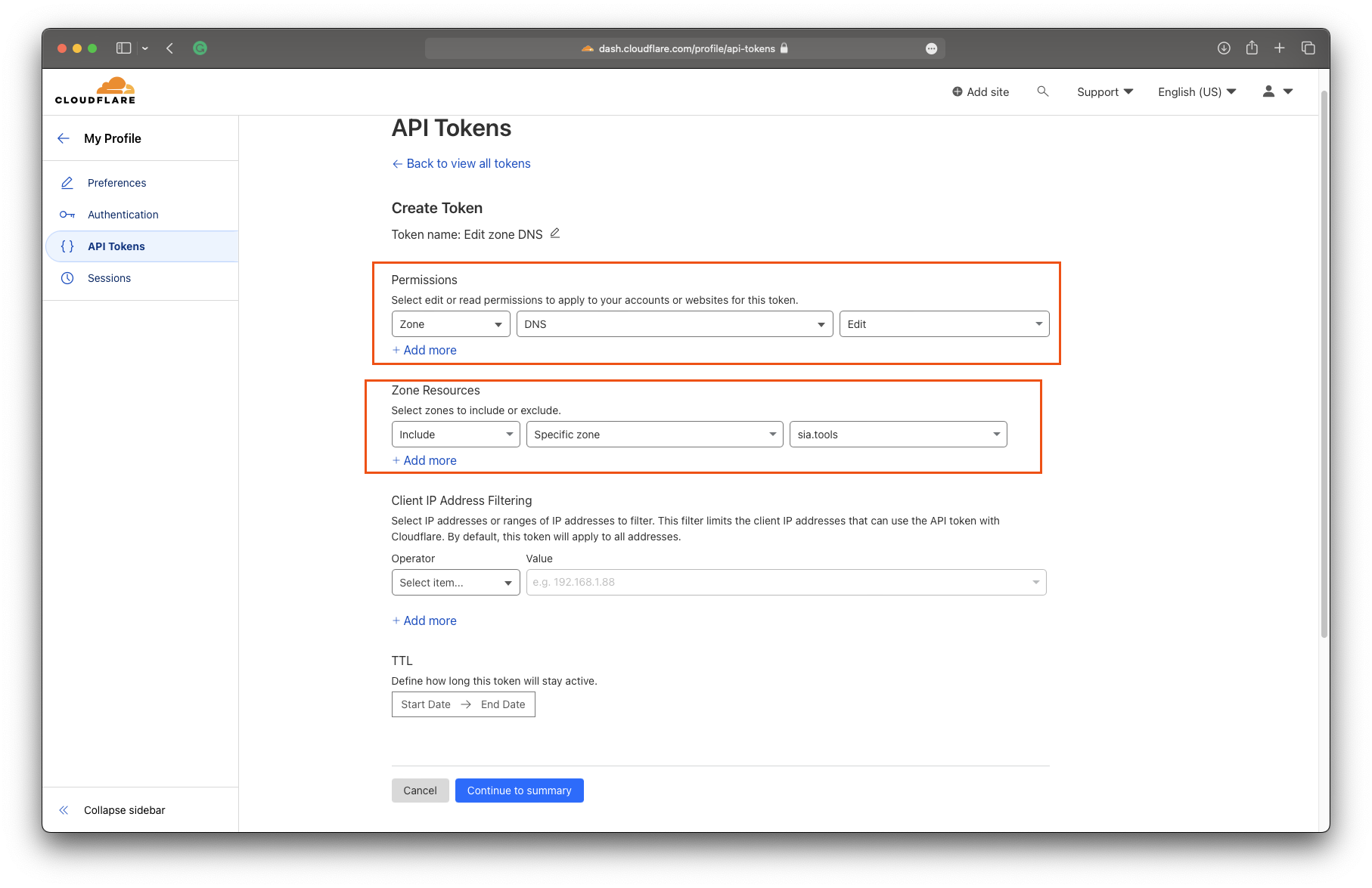 Under "Permissions," make sure that the token has the "Edit" permission on the DNS. Under "Zone Resources," make sure to "Include" the "Specific Zone" and select the domain we just added. Since you likely have a dynamic IP, leave "Client IP Address Filtering" blank. TTL is optional, but you will need to remember to create a new token, or your DDNS will break.