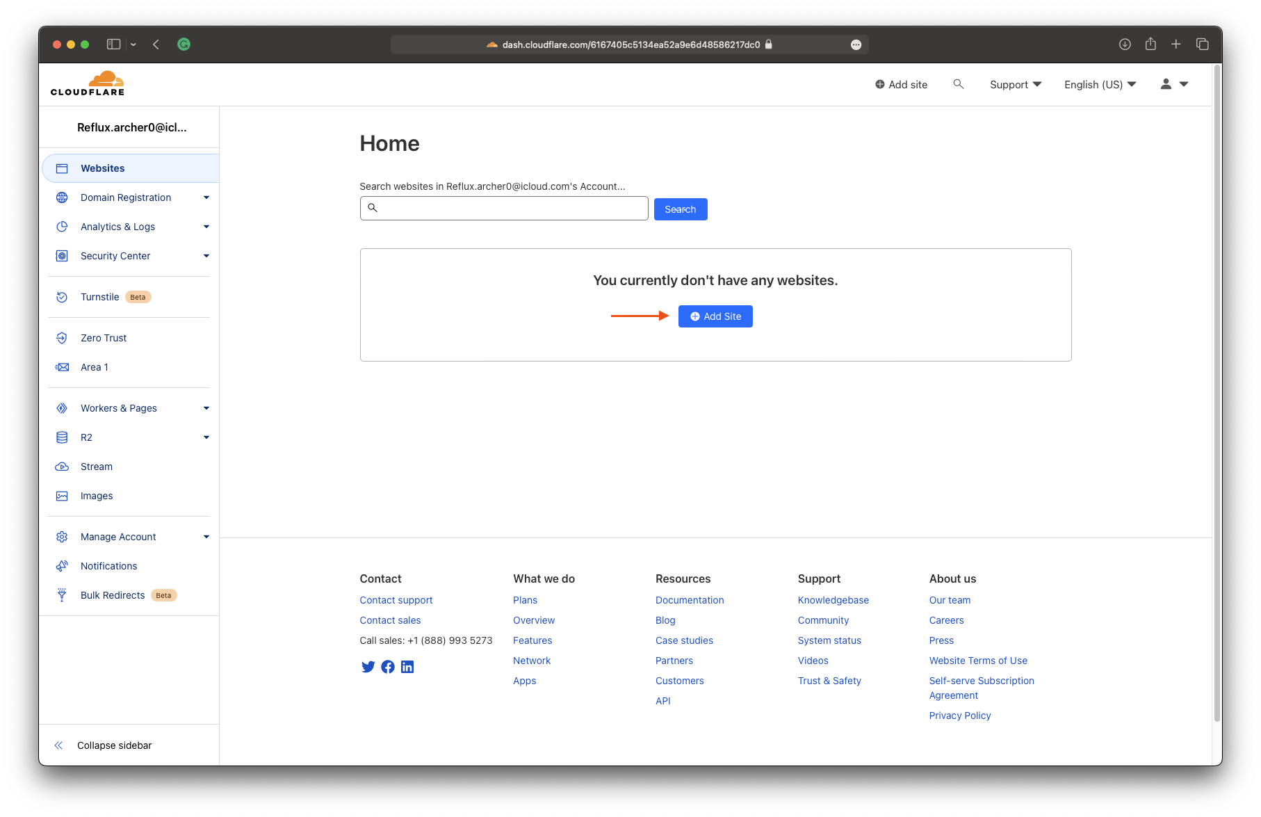 Once you've logged into Cloudflare, it's time to add your domain. If your domain is already added, skip to the next step. The site may look slightly different if your account already has a domain. To start the process, click the "Add Site" button.