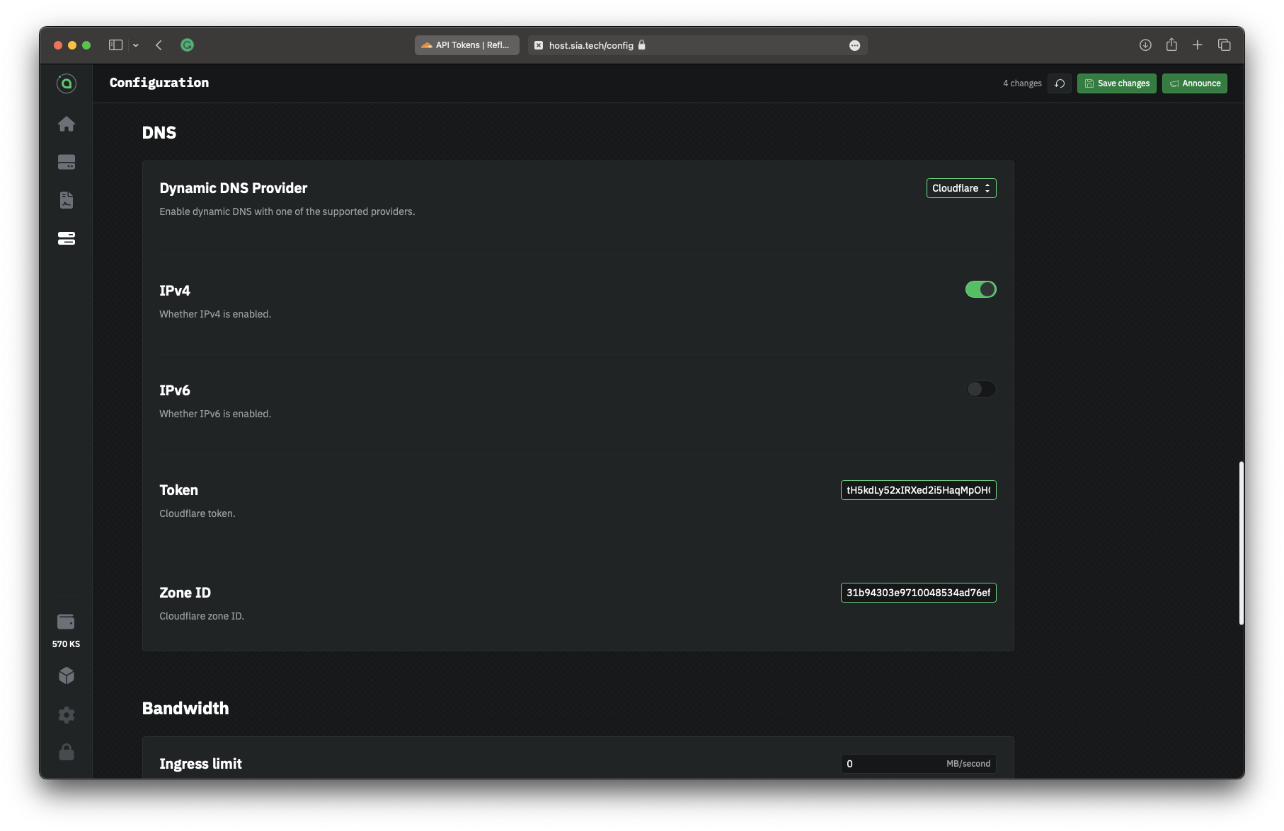 If you changed the settings correctly, you should see "Dynamic DNS enabled" in the top status bar. You will also need to announce your new net address so renters will be able to connect. `hostd` will now update your Cloudflare DNS record when your IP address changes.