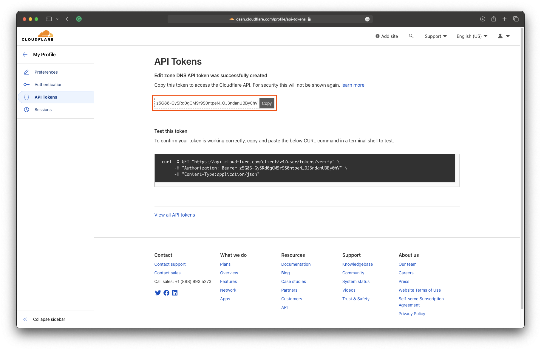 Once you have set the permissions, click "Continue to summary." On the summary screen, double-check that the token has DNS Edit access to the Zone we just added and click "Create". The token will be displayed on your screen. Copy the token now. Once you leave the page, it will not be shown again.