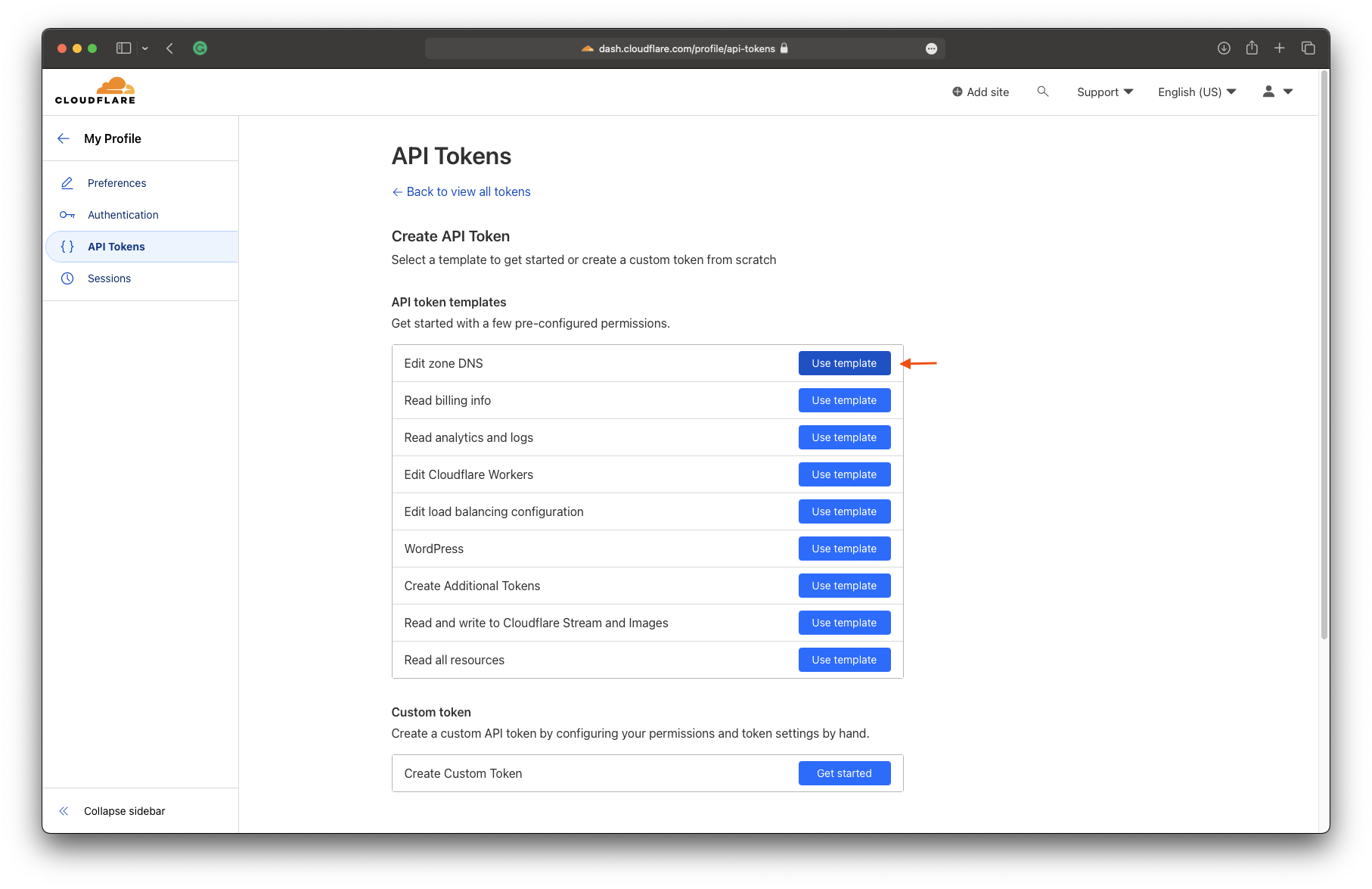 We will now create a token with only write access to the zone we created. In the API token templates click "Use Template" next to "Edit zone DNS."