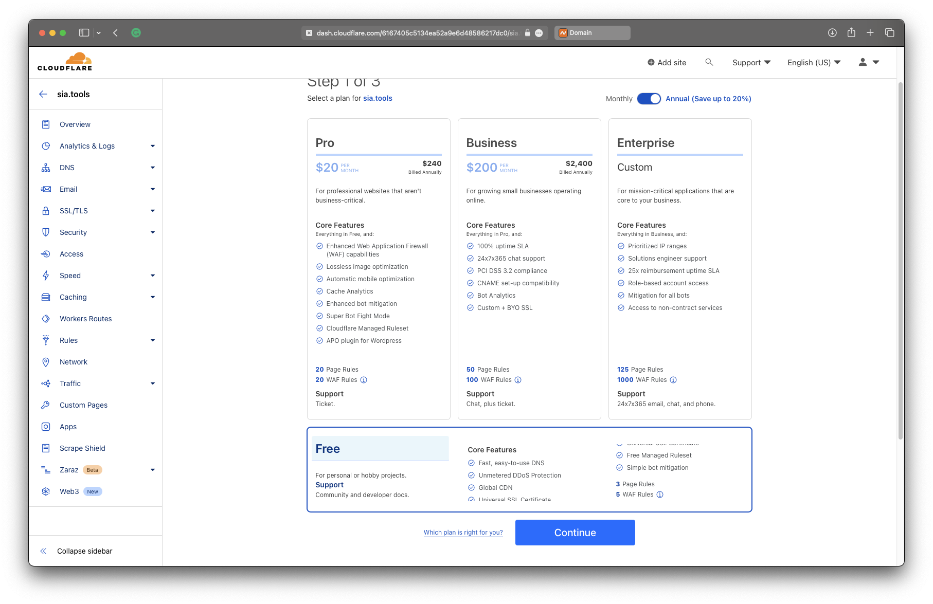 When adding the site, you will be asked which plan you would like. At the very bottom, select the Free plan since we only need DNS.