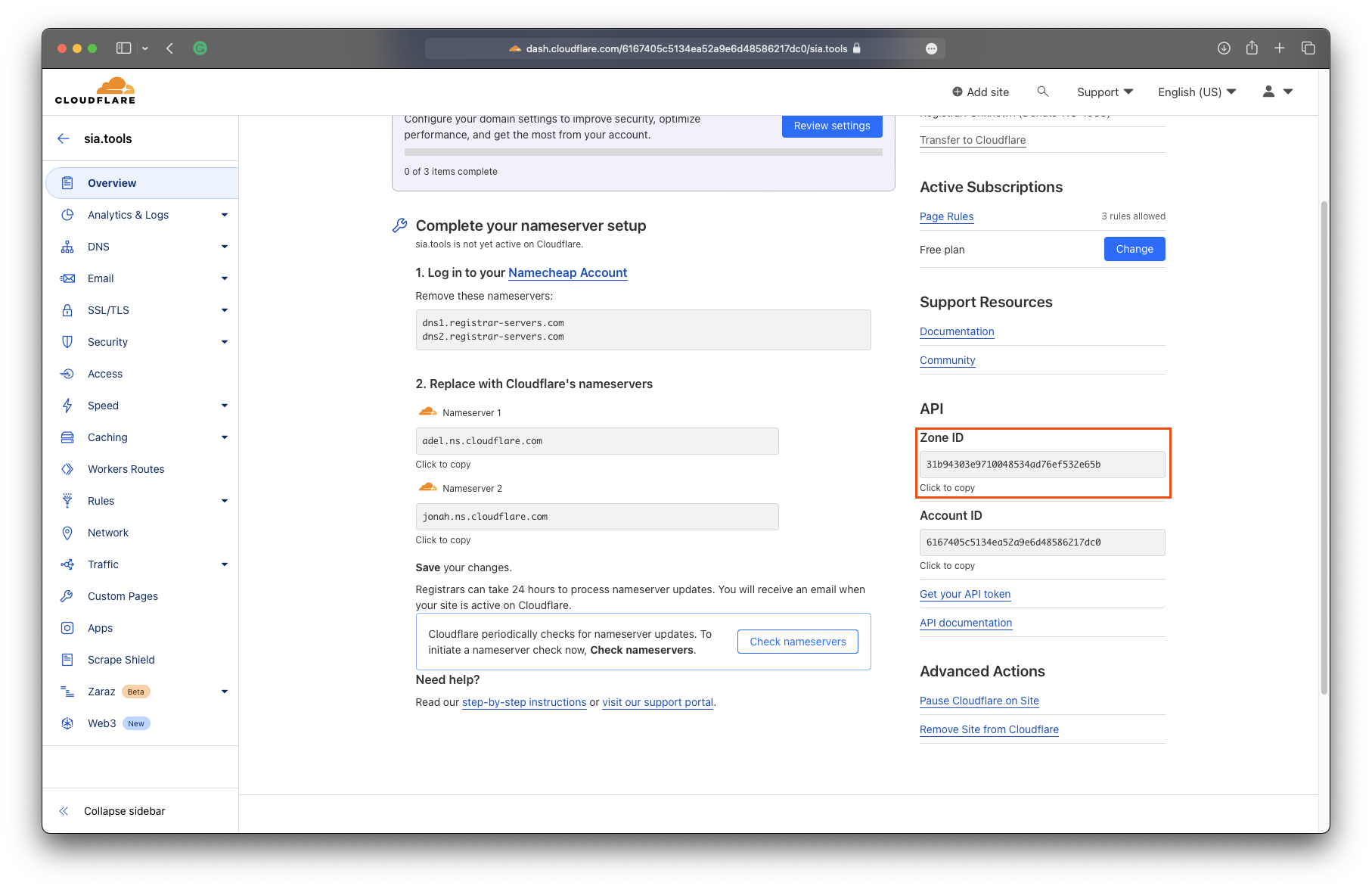 On the website Dashboard in the right-hand column is your domain's "Zone ID." Copy the Zone ID for later.