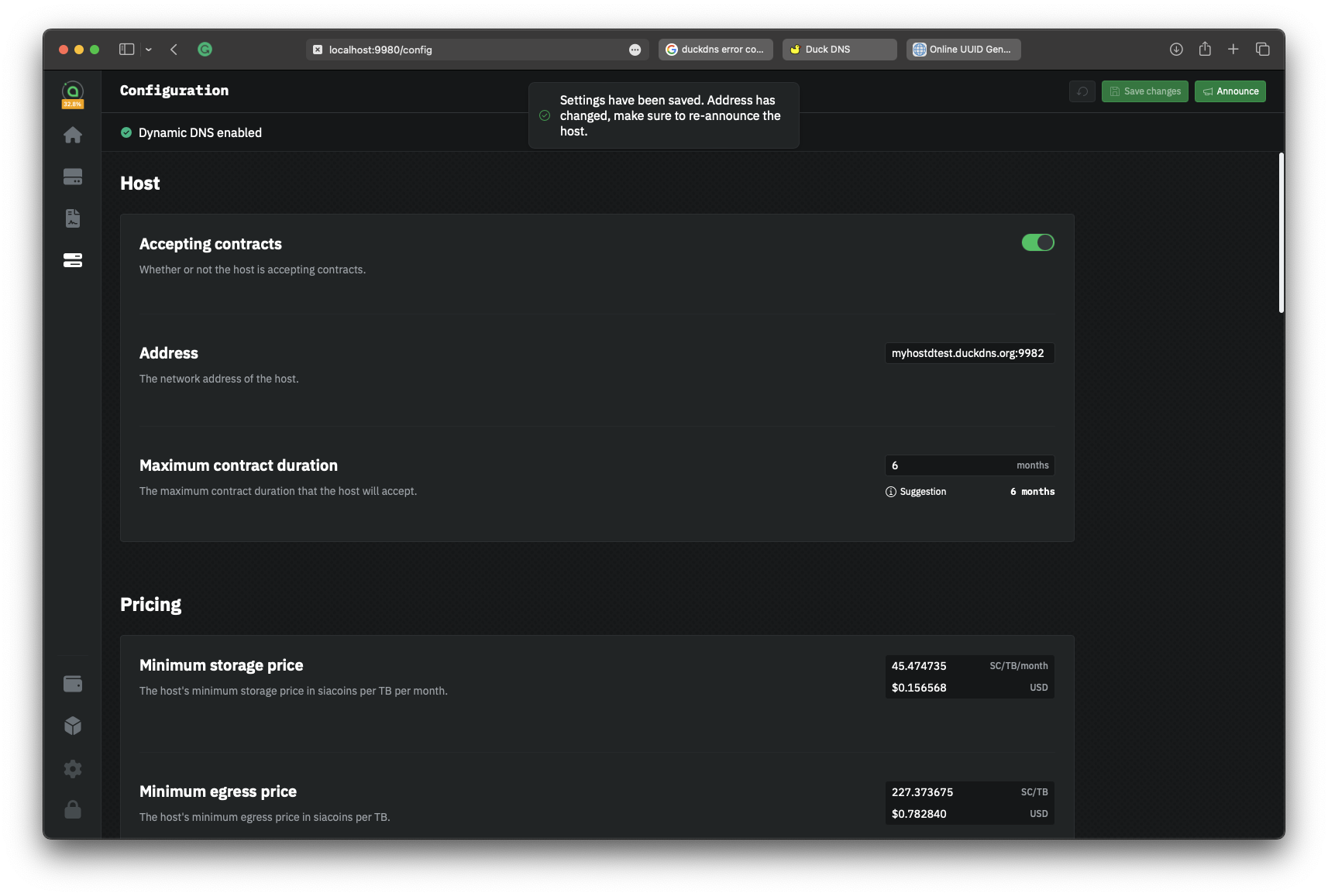If you changed the settings correctly, you should see "Dynamic DNS enabled" in the top status bar. You will also need to announce your new net address so renters will be able to connect.