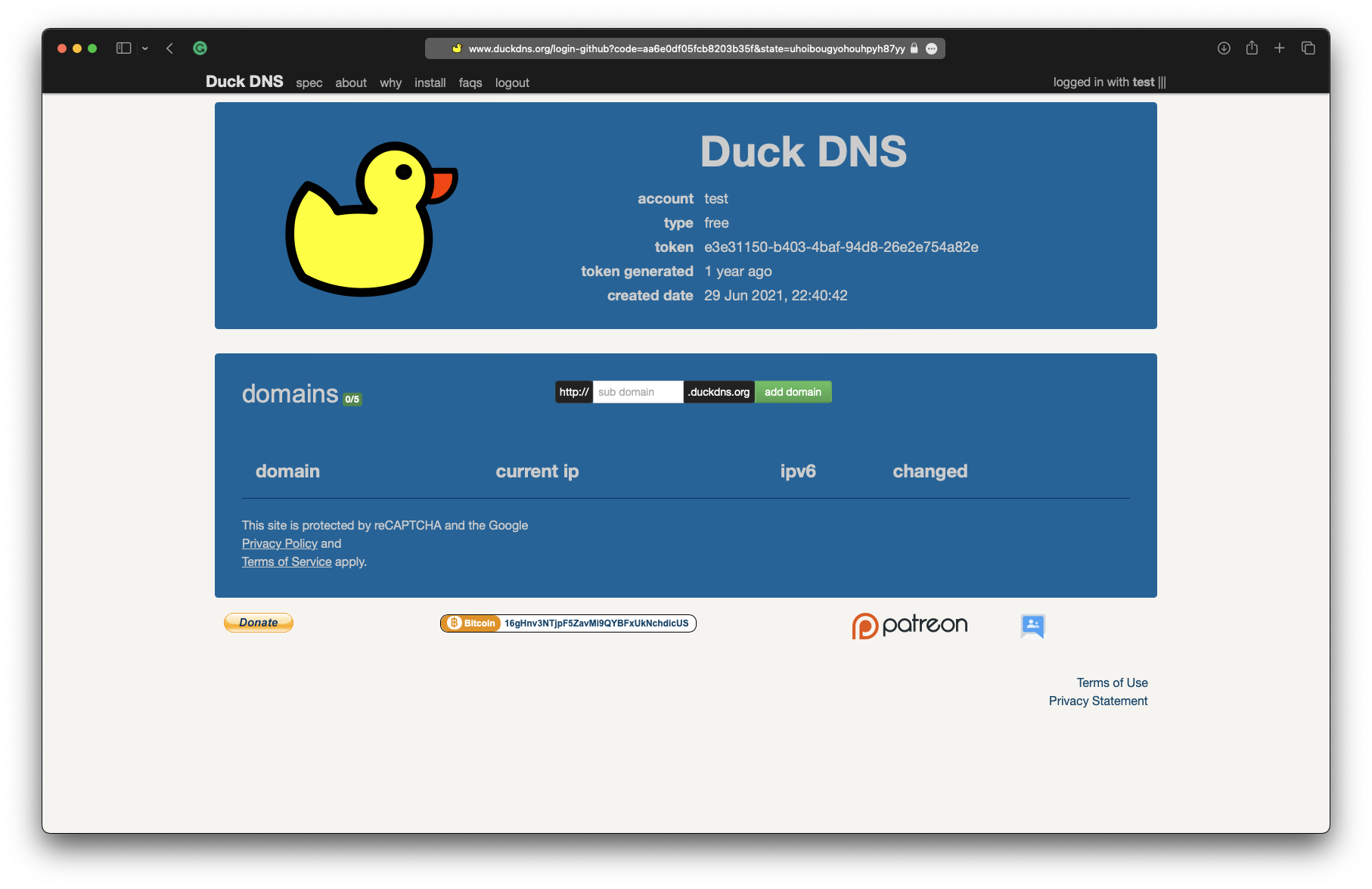 First, open a browser and go to <https://duckdns.org>. Sign in using one of their supported logins (Twitter, GitHub, Google, etc). You will be taken to the account management page, where you can create a free domain.