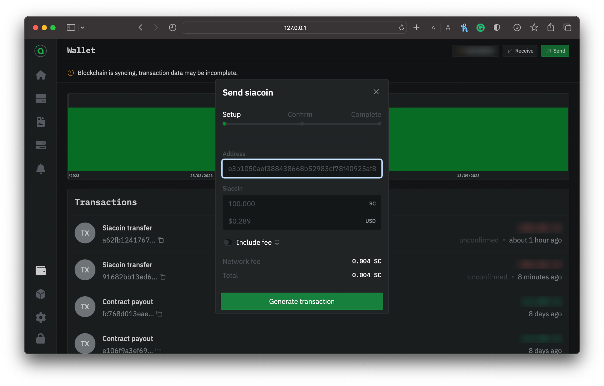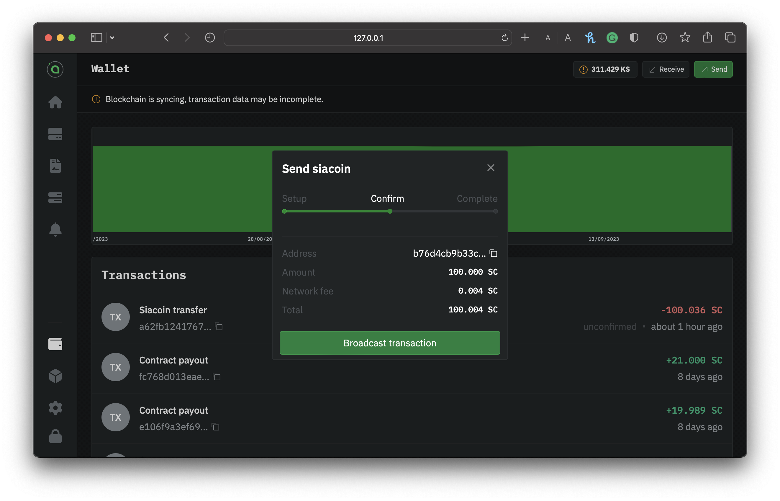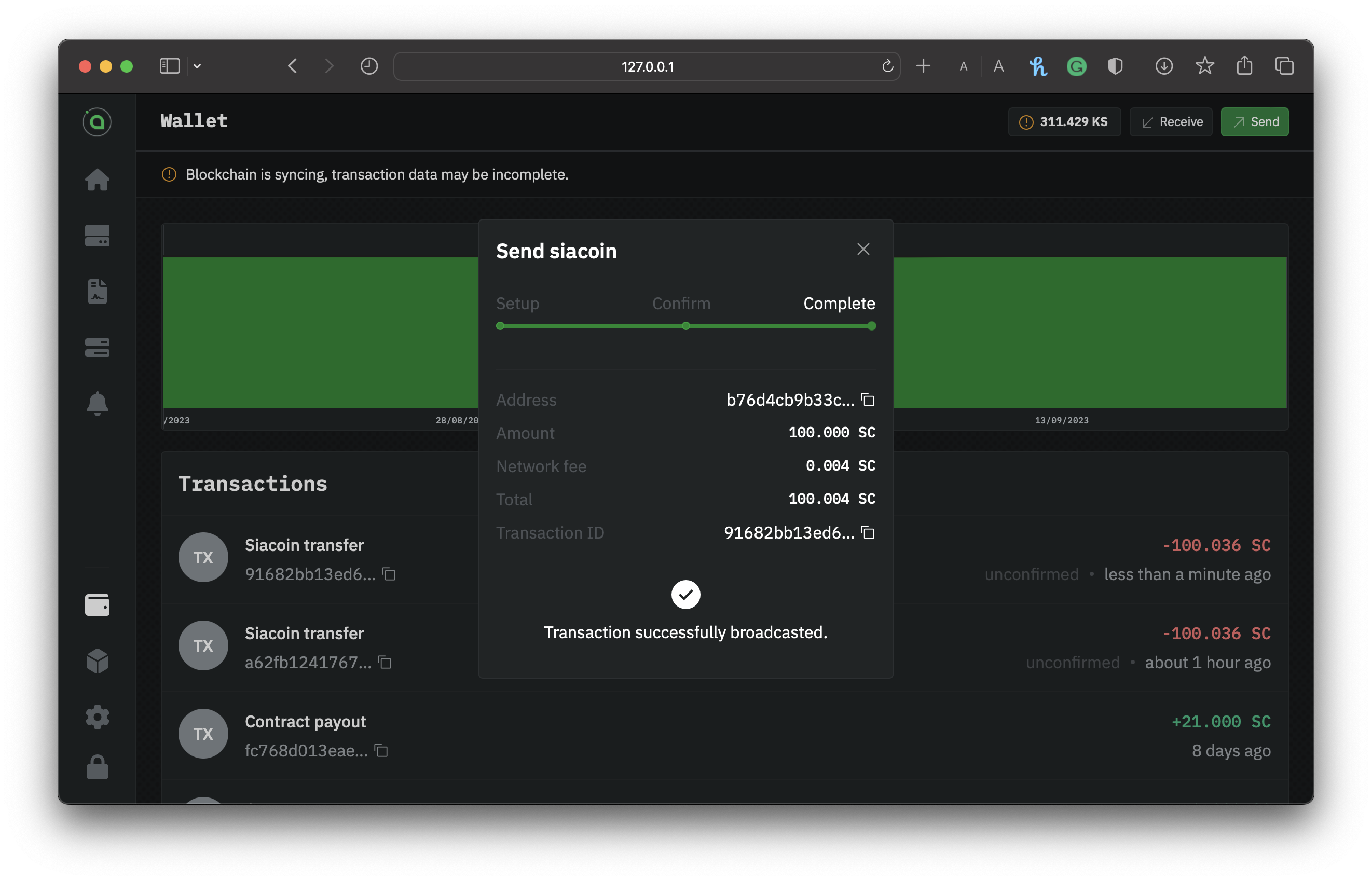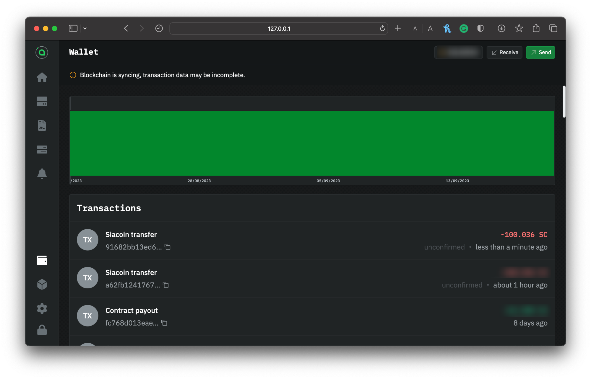 Whether you're sending Siacoins to an exchange or receiving from a friend, `hostd` facilitates the transfer of Siacoins (SC). You can check the transaction status, easily achieved via the UI.