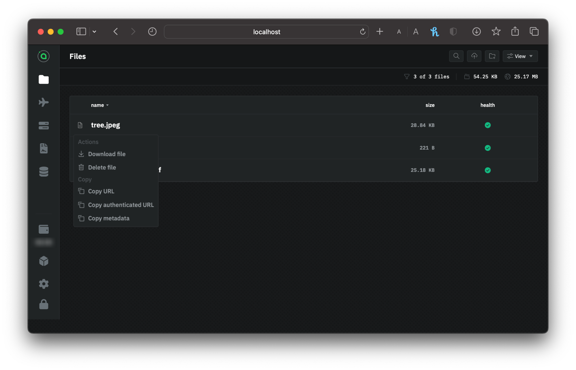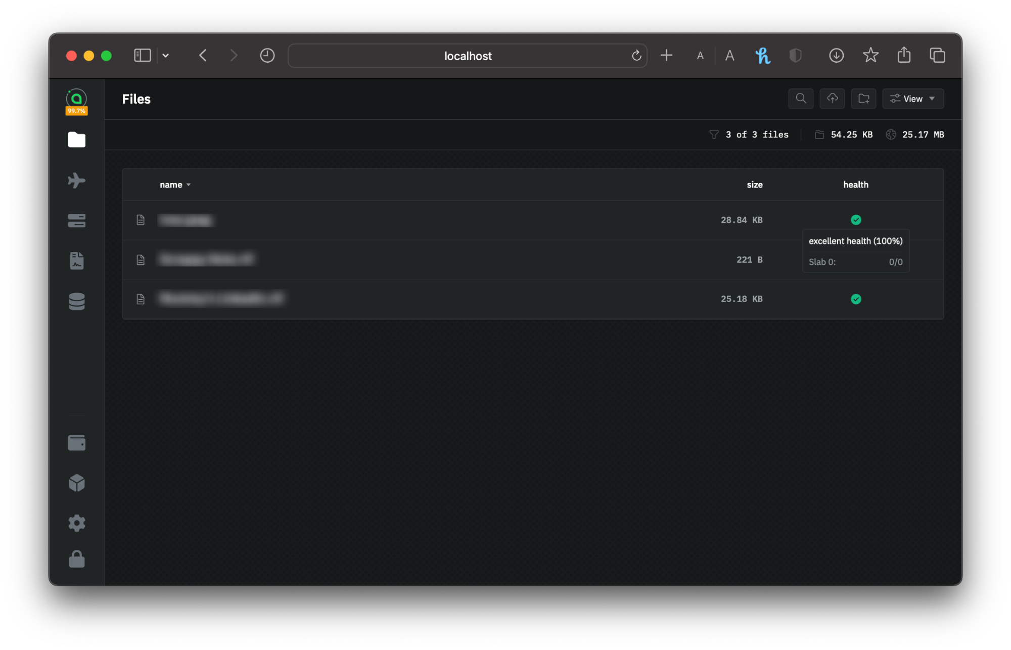 <figure><img src="https://3679771871-files.gitbook.io/~/files/v0/b/gitbook-x-prod.appspot.com/o/spaces%2F6w9fYqdazlo30V4aFg36%2Fuploads%2Fgit-blob-9a37897bfa07af3b1d6ae52ced75fdf12a36a1ac%2Frenter_7.png?alt=media" alt=""><figcaption><p>File health check in renterd</p></figcaption></figure>